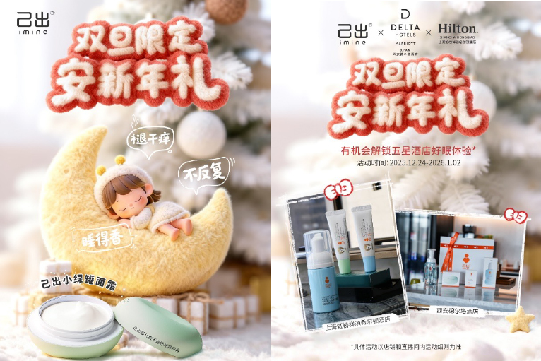 近日,专研婴童皮肤问题的功效性护肤品牌己出(隶属自然堂集团),于双旦期间推出“安新年礼”主题营销活动。此次活动初衷源于婴童常见皮肤困扰——干痒、湿疹等问题易导致宝宝不适抓挠,进而影响睡眠质量,而己出核心产品小绿罐可针对性解决这一痛点,其含有的专利成分“复儿爱倍健”能有效强韧肌肤屏障,守护宝宝安心睡眠。基于此,该品牌联合上海虹桥祥源希尔顿酒店、西安德尔塔酒店两家国内五星级酒店,以线上福利与线下沉浸式体验相结合的形式,为亲子家庭提供兼具肌肤呵护与节日仪式感的礼遇,活动时间为2025年12月24日至2026年1月2日。